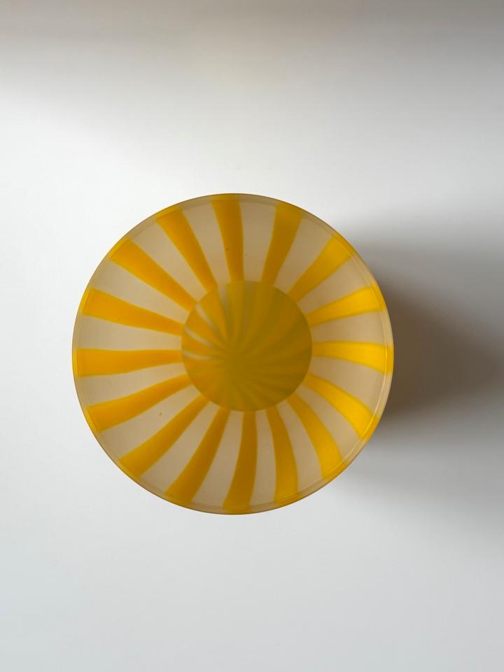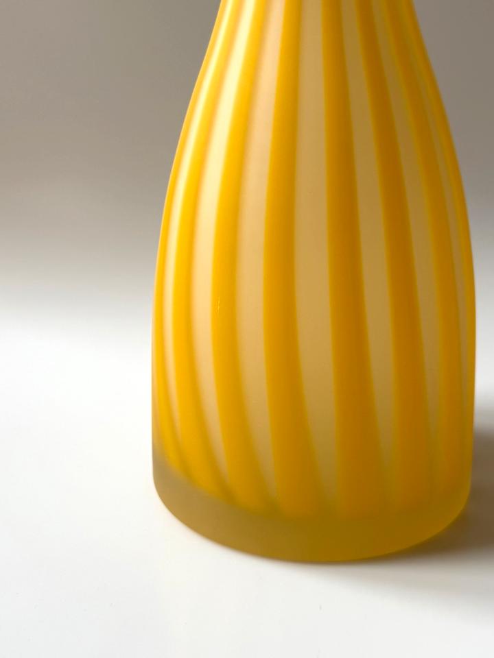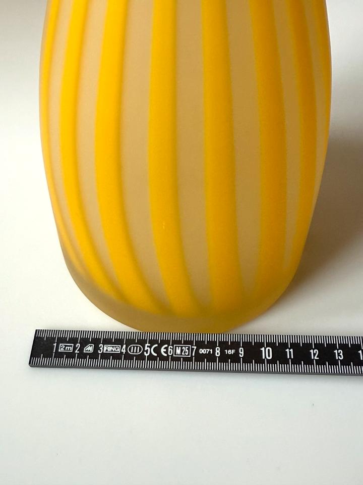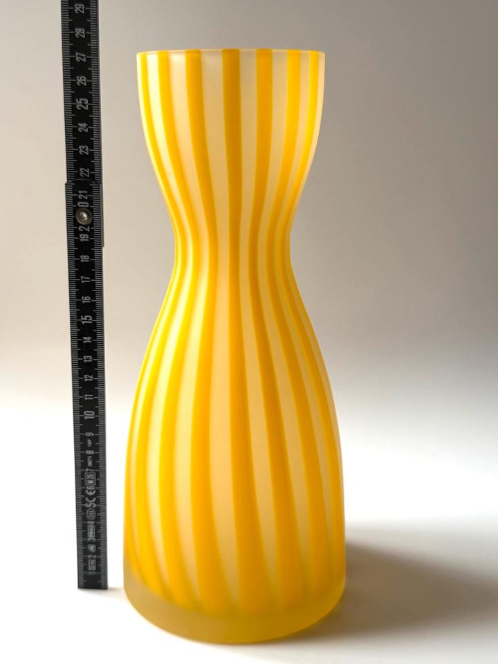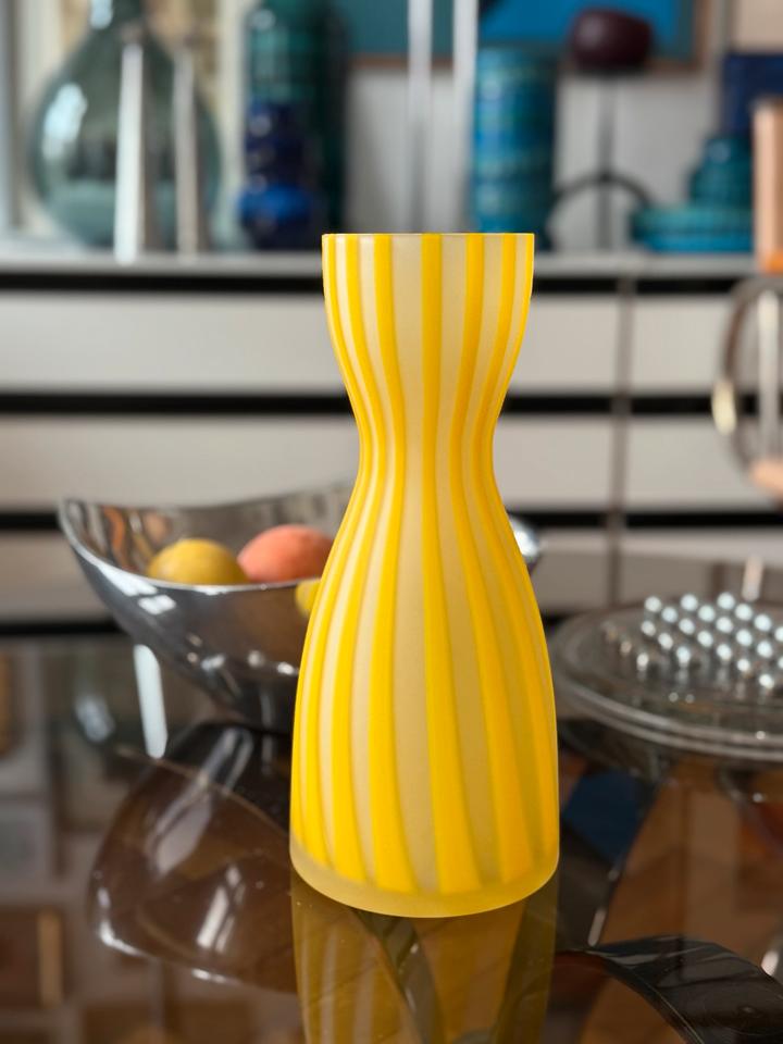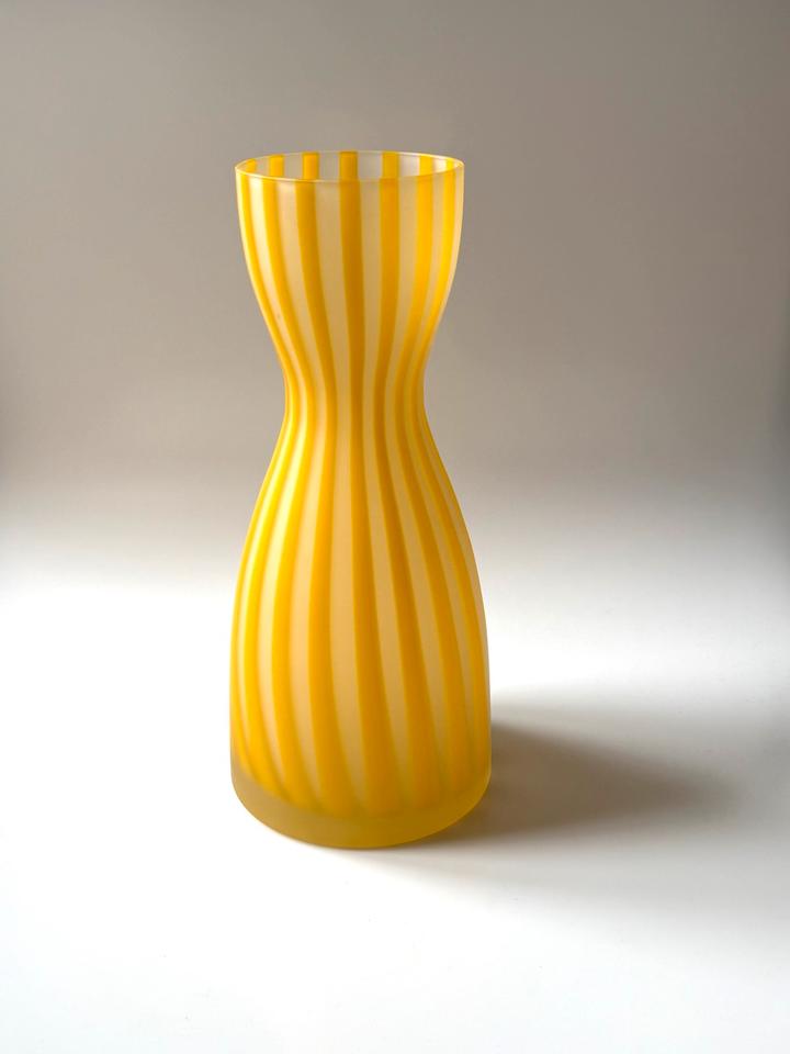 Mittelgroße mundgeblasene Vase aus gelb gestreiftem mattem Swirl-Glas, vermutlich in Italien hergestellt.