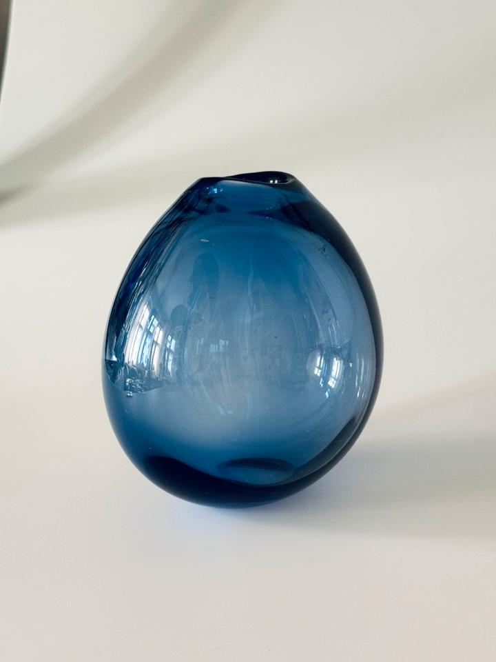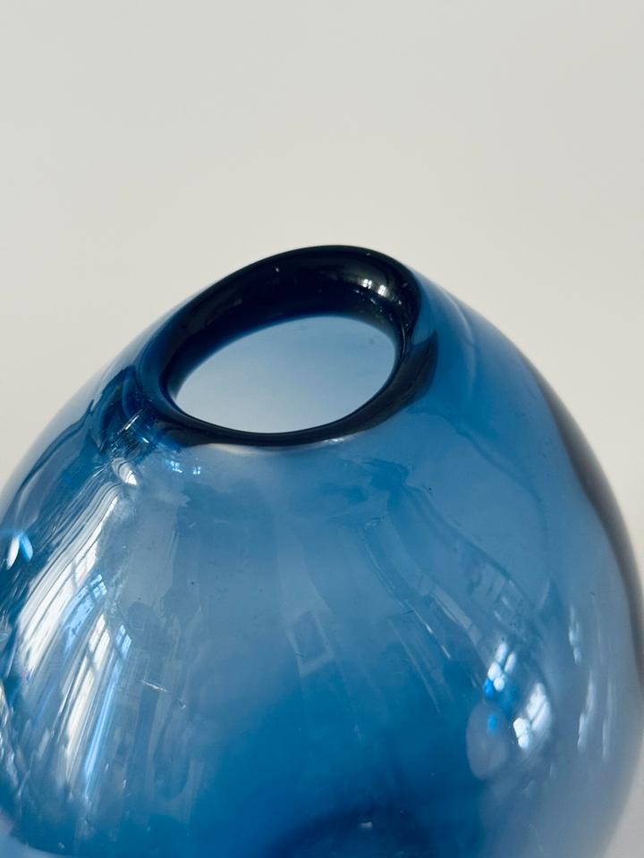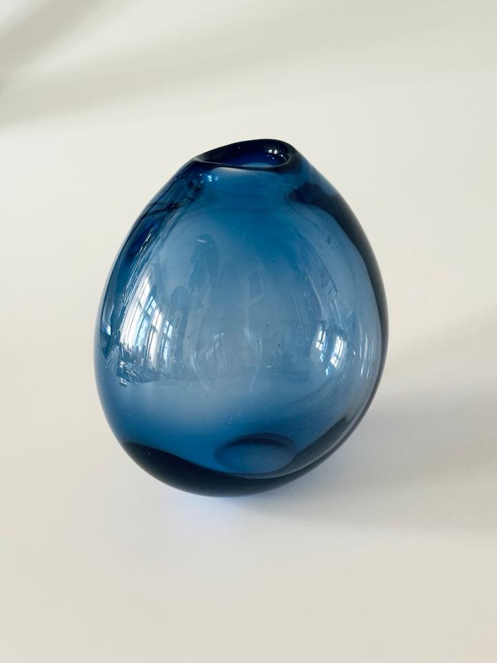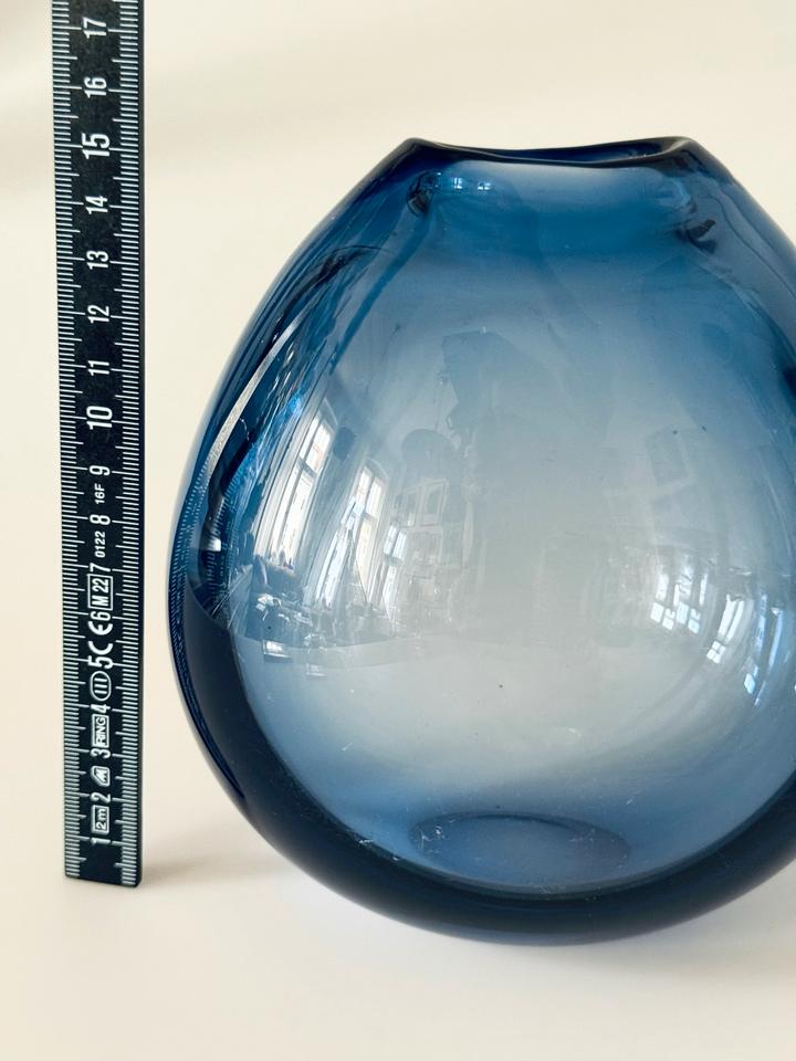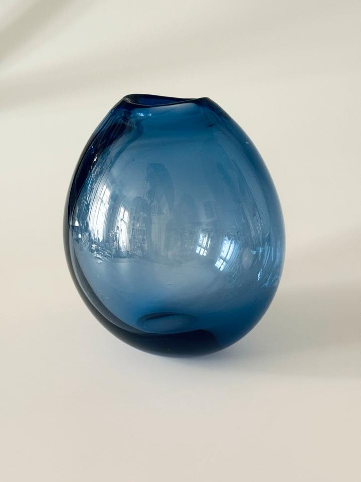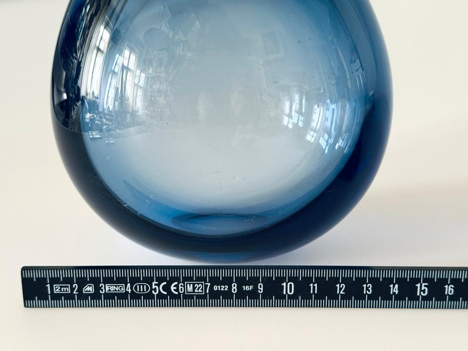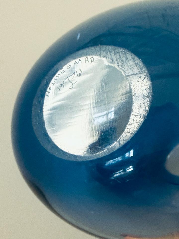 Die schwere Vase ist mit und ohne Blumen ein zauberhafter Eyecatcher. Sie ist hochwertig verarbeitet und in gutem Zustand mit moderaten Gebrauchsspuren in Form von Kratzern. Die Signatur am Boden zeigt „Holmegaard“, „1961“ und ein verschnörkeltes „PL“, für Per Lütken.
