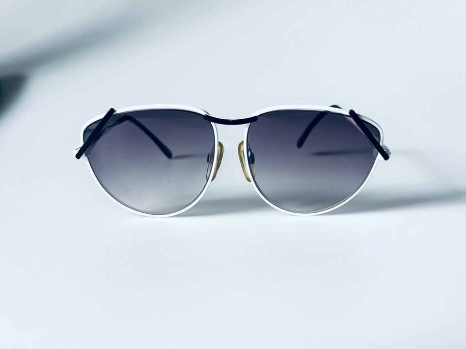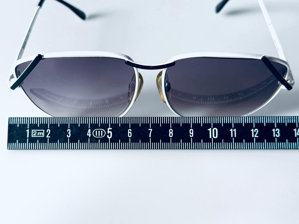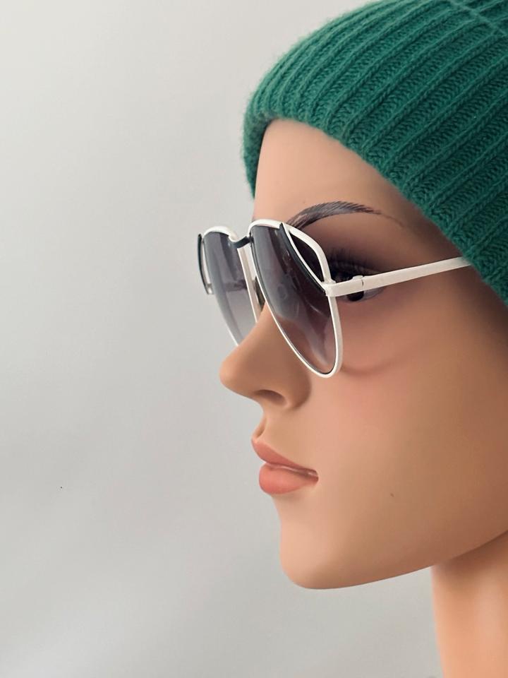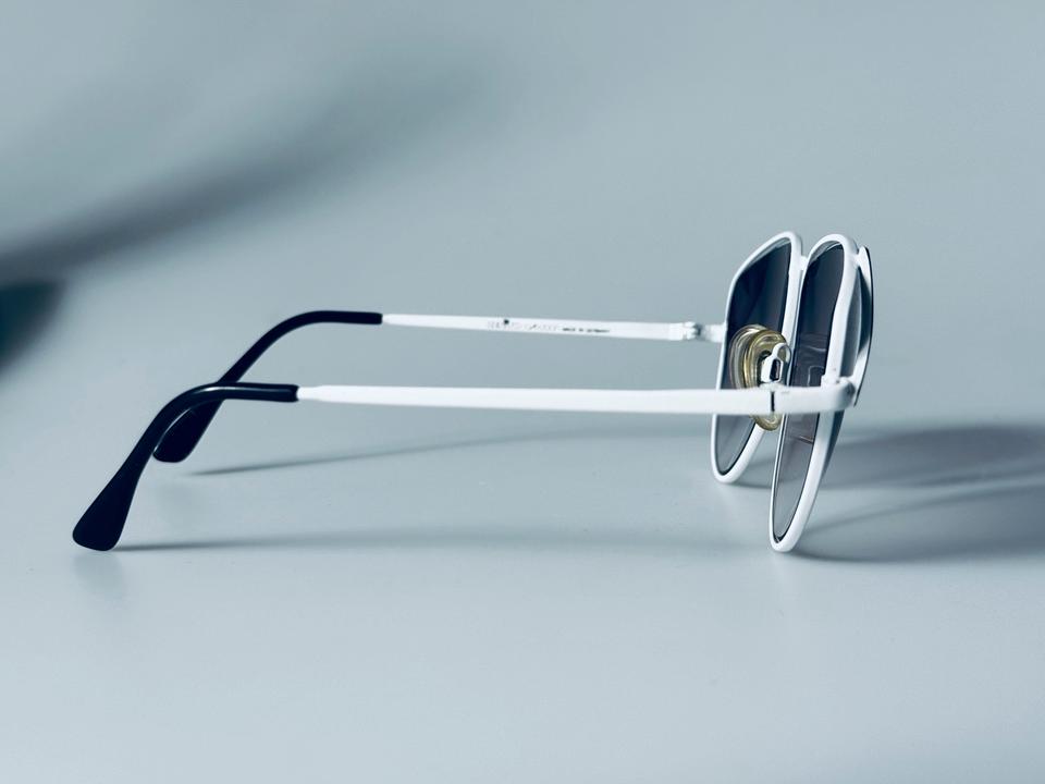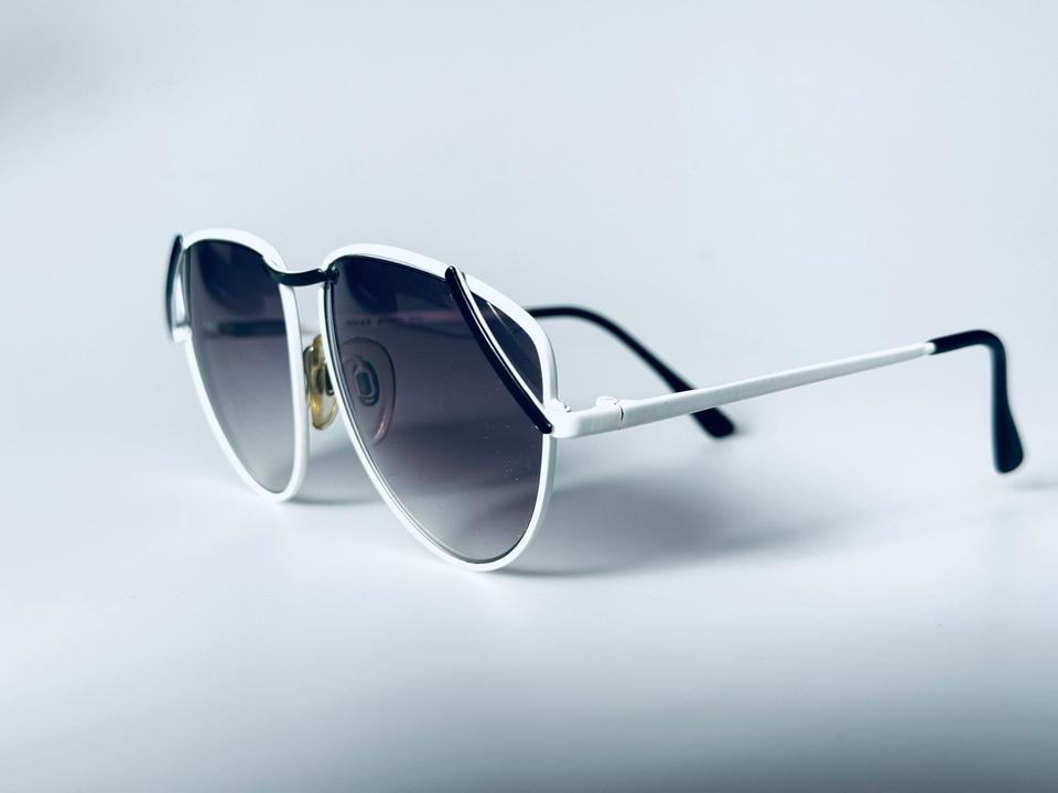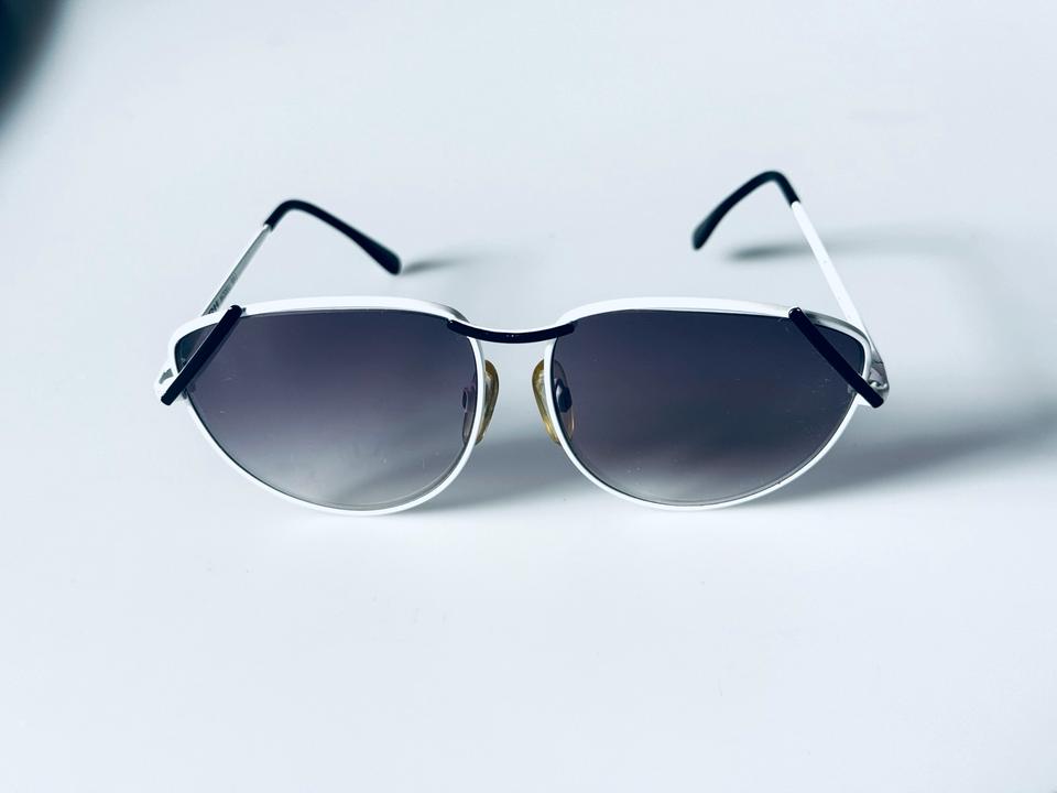 Vintage Sonnenbrille aus weiß lackiertem Metall von R+H Germany, 1980er. Die Brille ist in gutem Vintage- Zustand mit partiellen Alters-und Gebrauchsspuren und darüber hinaus hochwertig verarbeitet, wie auch auf den Fotos zu erkennen ist. Die Gläser sind violett im Verlauf getönt und bestehen aus Normalglas ohne Stärken.