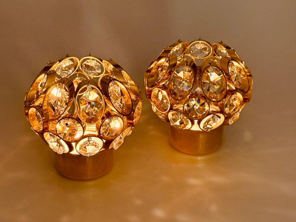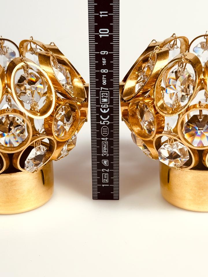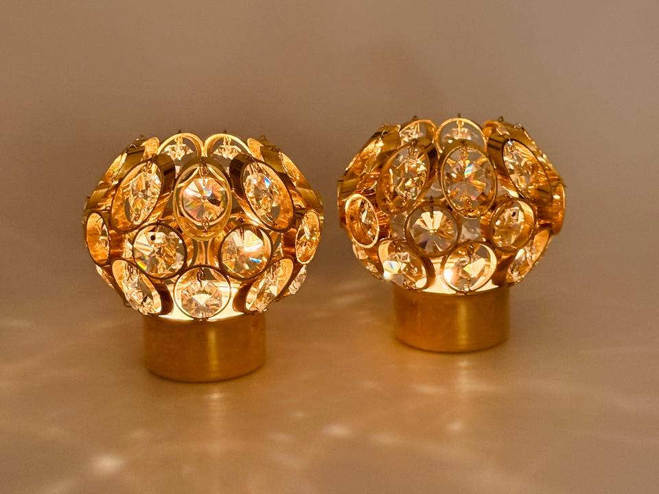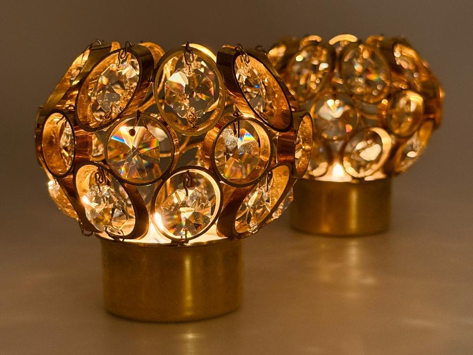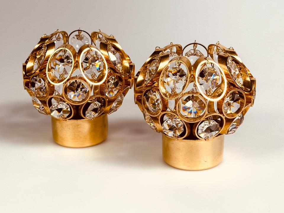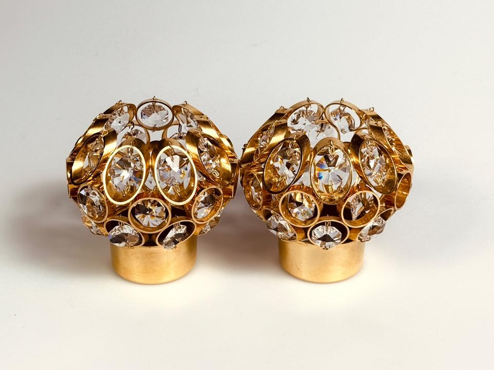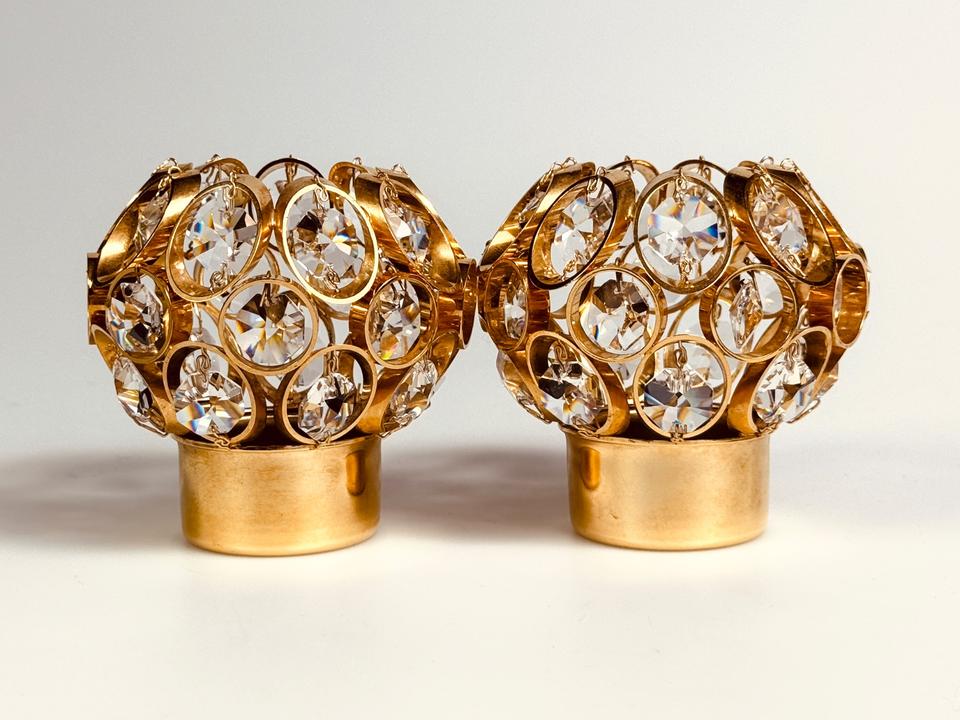 Paar Kerzenständer bzw. Teelichthalter von Weinfurtner. Die hochwertig gearbeiteten Teelichhalter bestehen aus 24 Karat vergoldetem Metall und facettierten Bleikristallen. Sie sind sehr gut erhalten und weisen nur minimale Gebrauchsspuren auf, siehe Bilder.