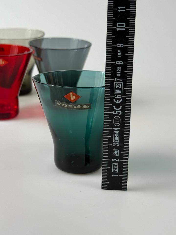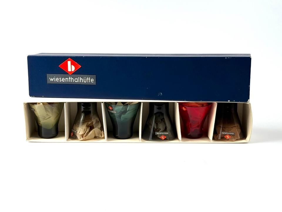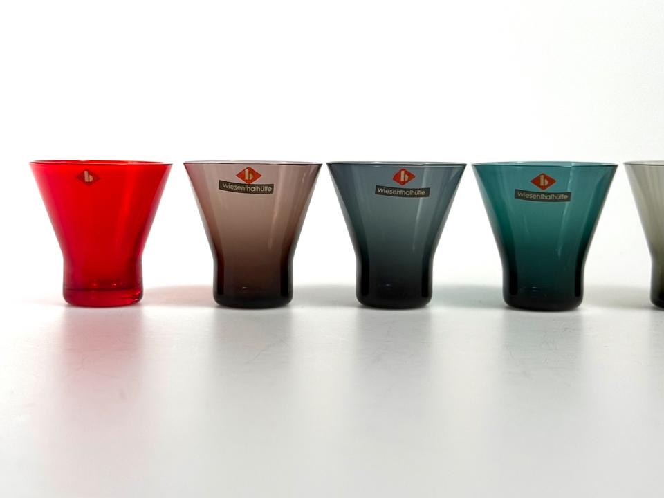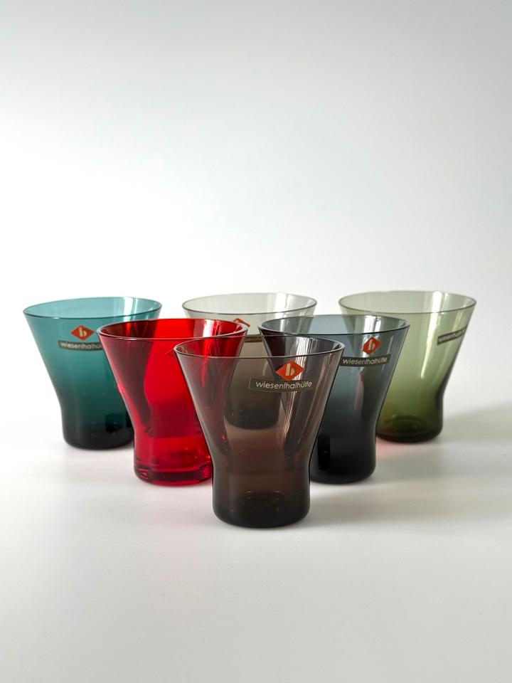 Set aus sechs bunten mundgeblasenen Schnapsgläsern aus Glas, Klaus Breit für Wiesenthalhütte, 1960/70er Jahre, Deutschland.