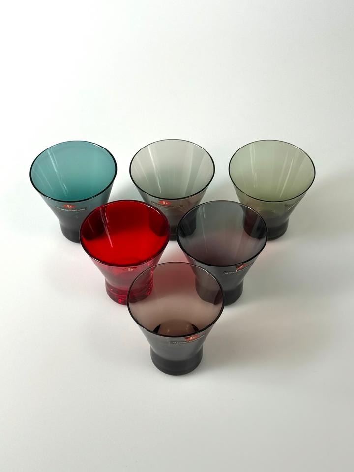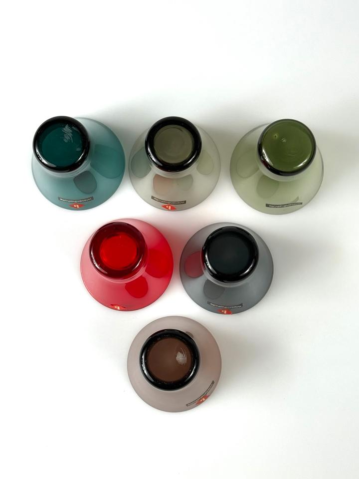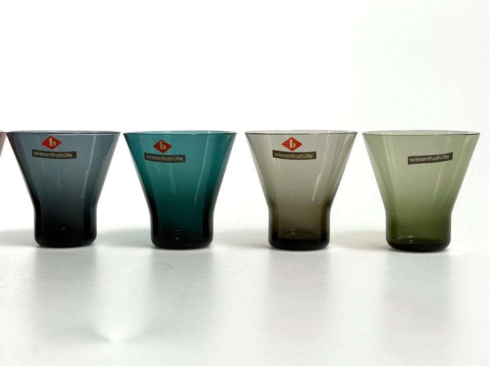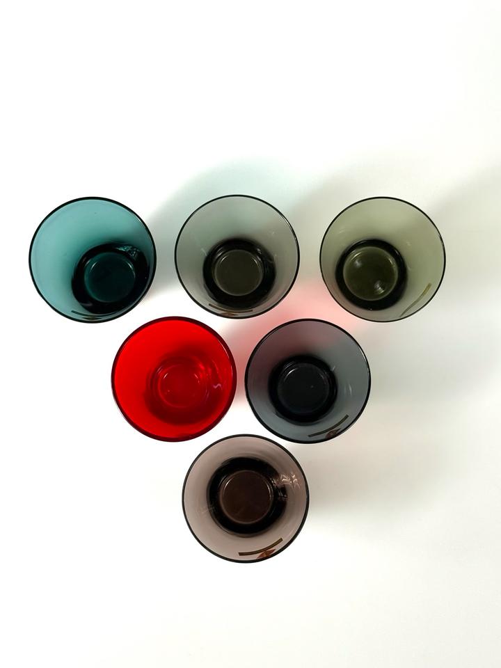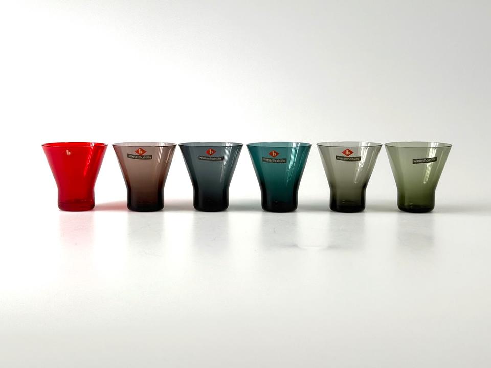Set aus sechs bunten mundgeblasenen Schnapsgläsern aus Glas, Klaus Breit für Wiesenthalhütte, 1960/70er Jahre, Deutschland.