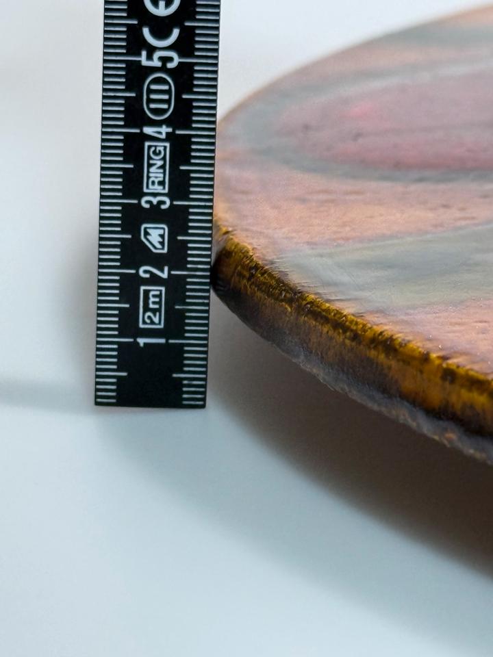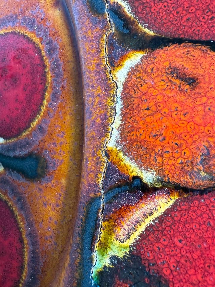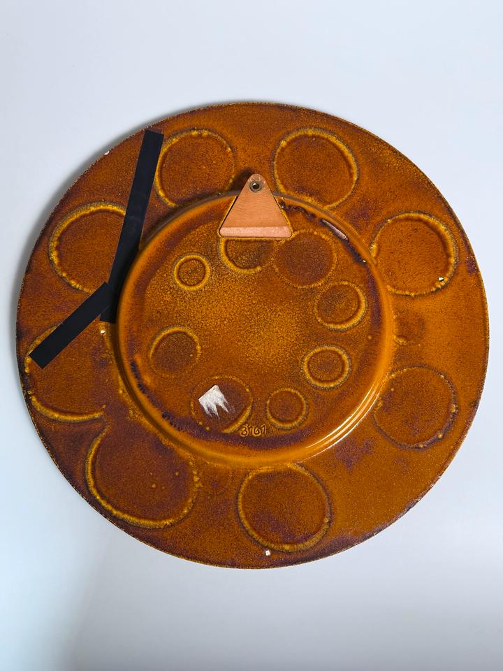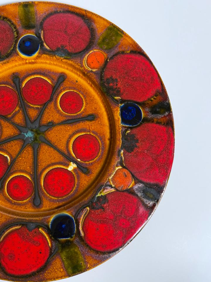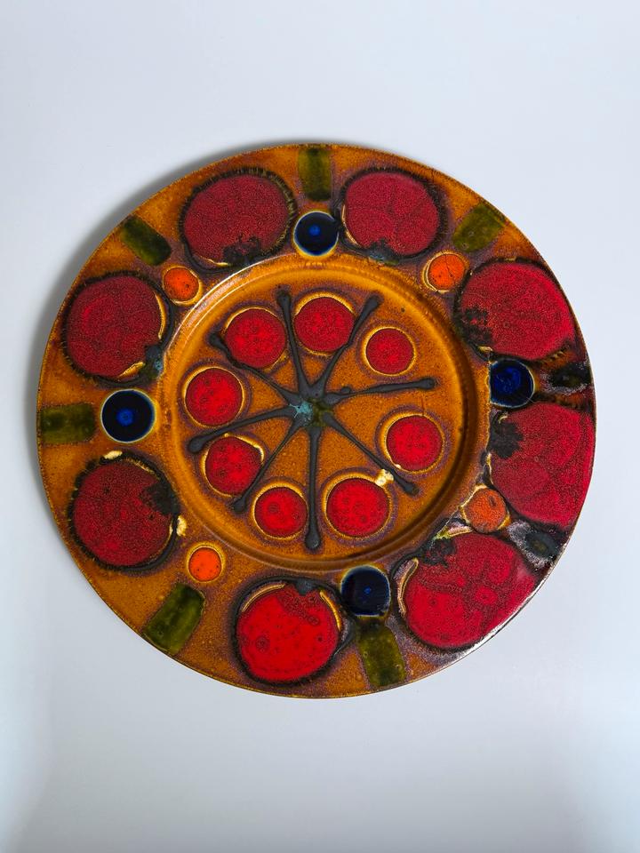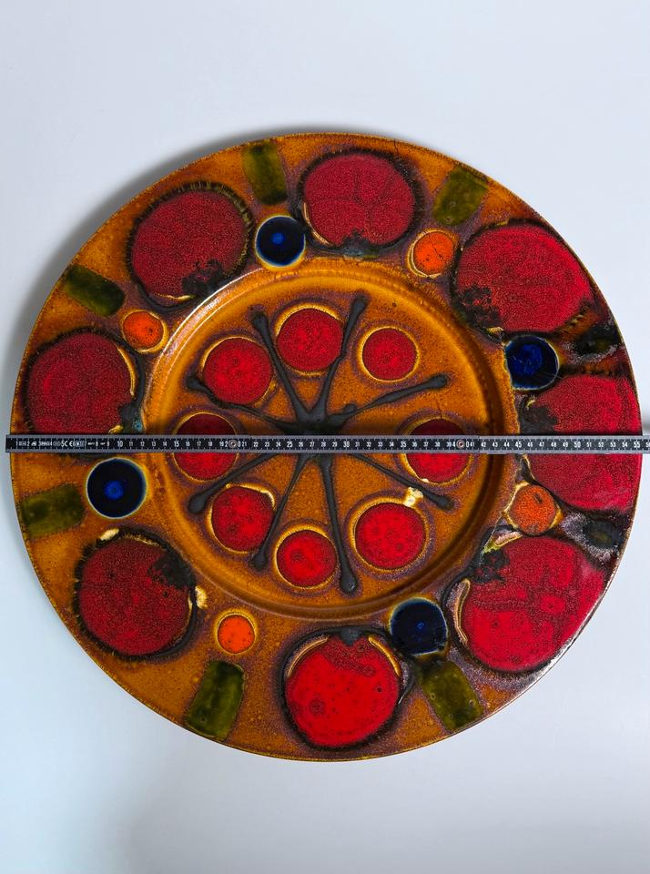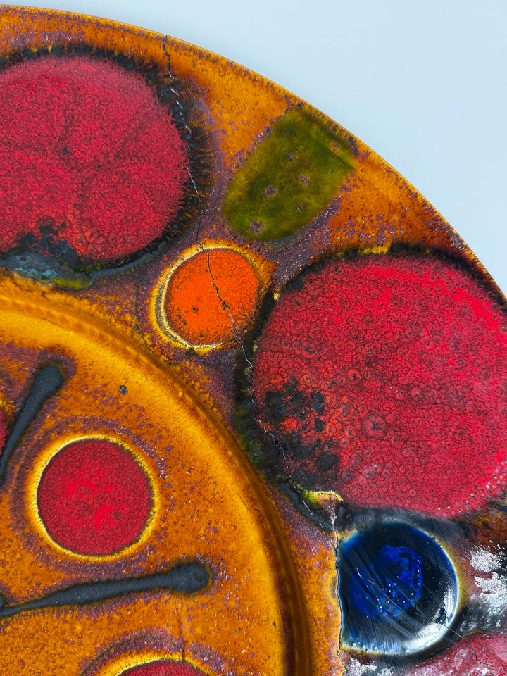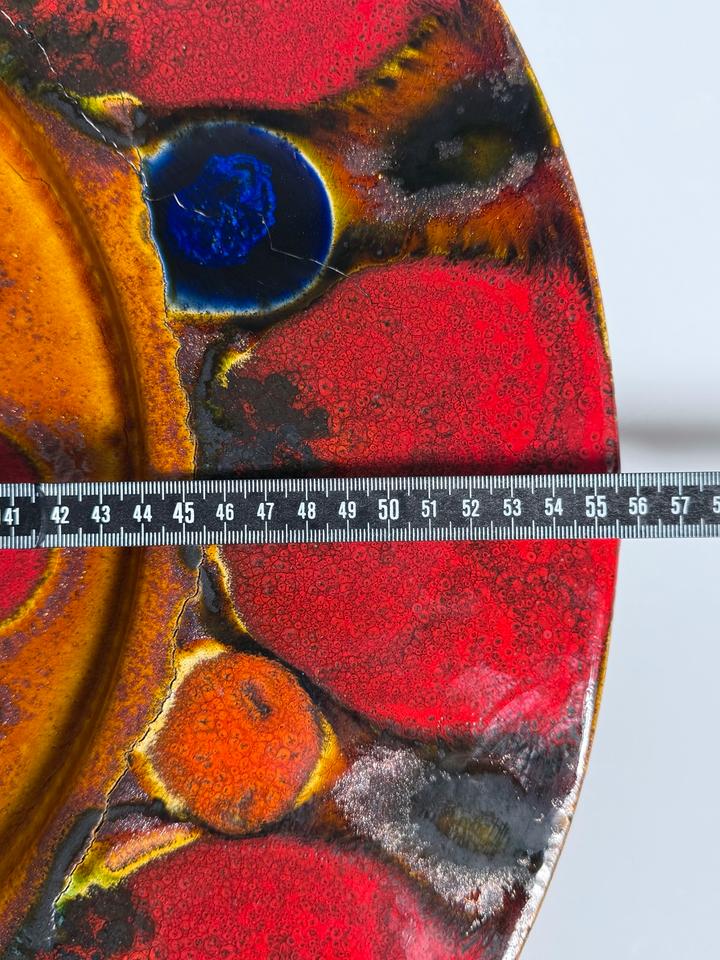 Großer Keramikteller mit dem Durchmesser von 56 cm, Grünstadt Keramik, Deutschland, 1960er Jahre. Der dekorative Teller ist in in leuchtenden Farben, kombiniert mit einer schimmernden Kupferglasur und schwarzer Fettlava-Glasur gehalten. Er hat einen Sprung, der sich in zwei weitere verzweigt. Diese sind nicht geklebt, lediglich an der Rückseite getapt.
